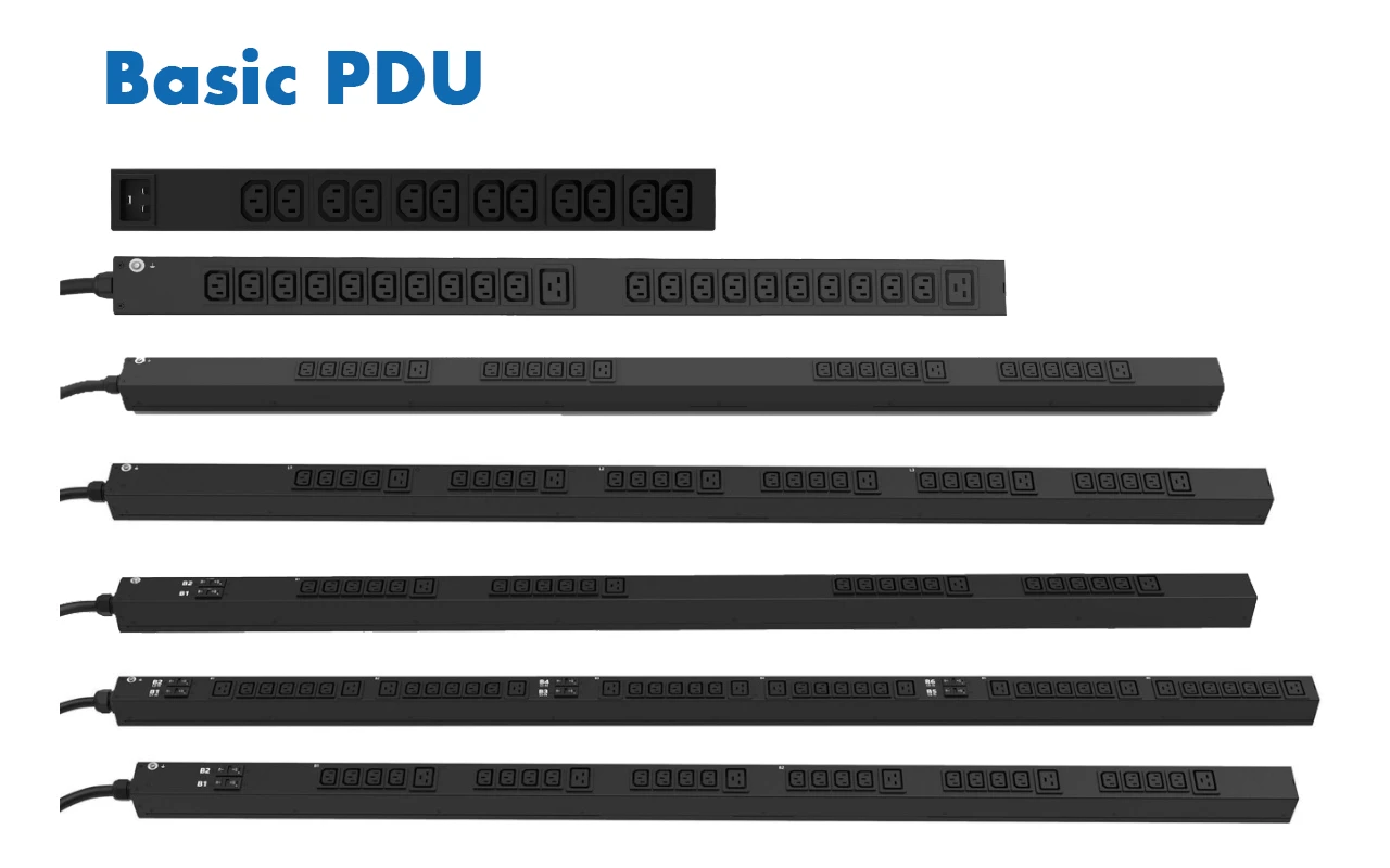 - Outlets are evenly distributed across the entire height of the vertical PDUs